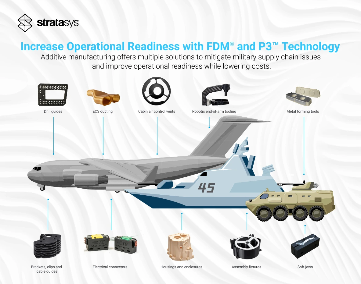 When operational readiness depends on agility, waiting months for critical parts isn’t an option. Stratasys helps defense organizations accelerate supply, cut costs, and maintain mission effectiveness with proven additive manufacturing solutions.
